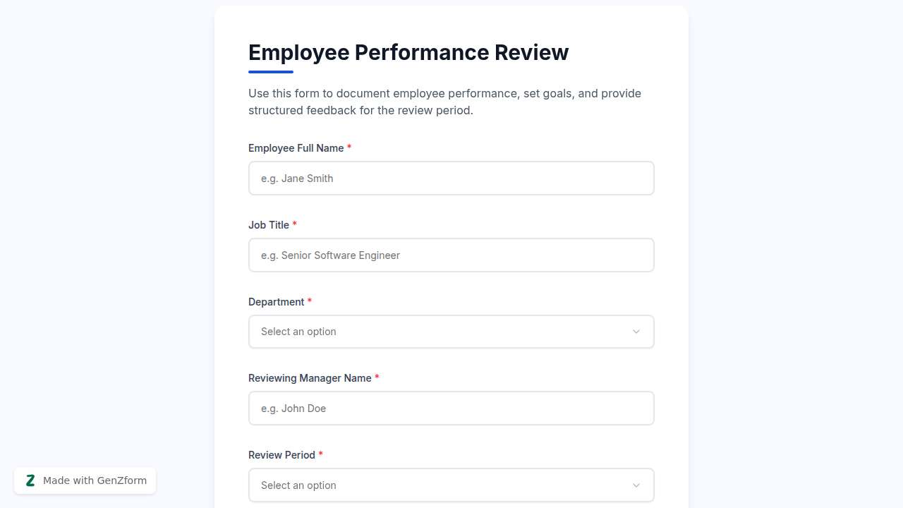 Run structured employee performance reviews with this ready-to-use HR form. Built for managers and HR teams who need a consistent, fair review process. 13 fields covering goals, competencies, ratings, and development plans Star ratings and dropdown selectors for quick scoring Open-ended sections for qualitative feedback Works for annual, mid-year, or quarterly cycles Average completion time: 8 minutes Used by HR teams at companies with as few as 10 and as many as 10,000 employees.