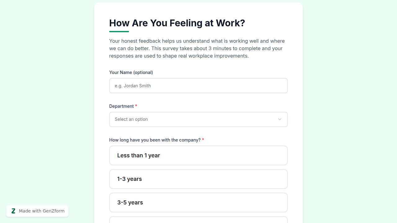 Measure employee satisfaction, manager effectiveness, and cultural fit with this ready-to-use engagement survey. Key features: 13 fields covering satisfaction, work-life balance, growth, culture, and open feedback Star ratings and numeric scales for trackable benchmarks over time Anonymous-friendly design with optional name and email fields Average completion time: 3 minutes Export to CSV, Google Sheets, or connect via Zapier to your HR tools Built for HR teams, people managers, and operations leads who want actionable data without spending hours on survey design.