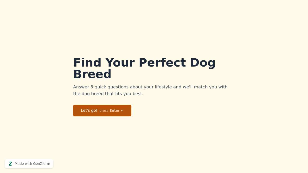 Find your perfect canine companion with this personalized dog breed recommendation quiz. In just 5 questions, discover which breed matches your activity level, living space, experience, and family situation. 5 targeted lifestyle questions covering activity, home type, experience, household, and grooming Personalized breed matches with care guides and personality traits for 8 popular breeds Instant results with a full breakdown of why the breed suits your lifestyle Estimated completion time: 2-3 minutes