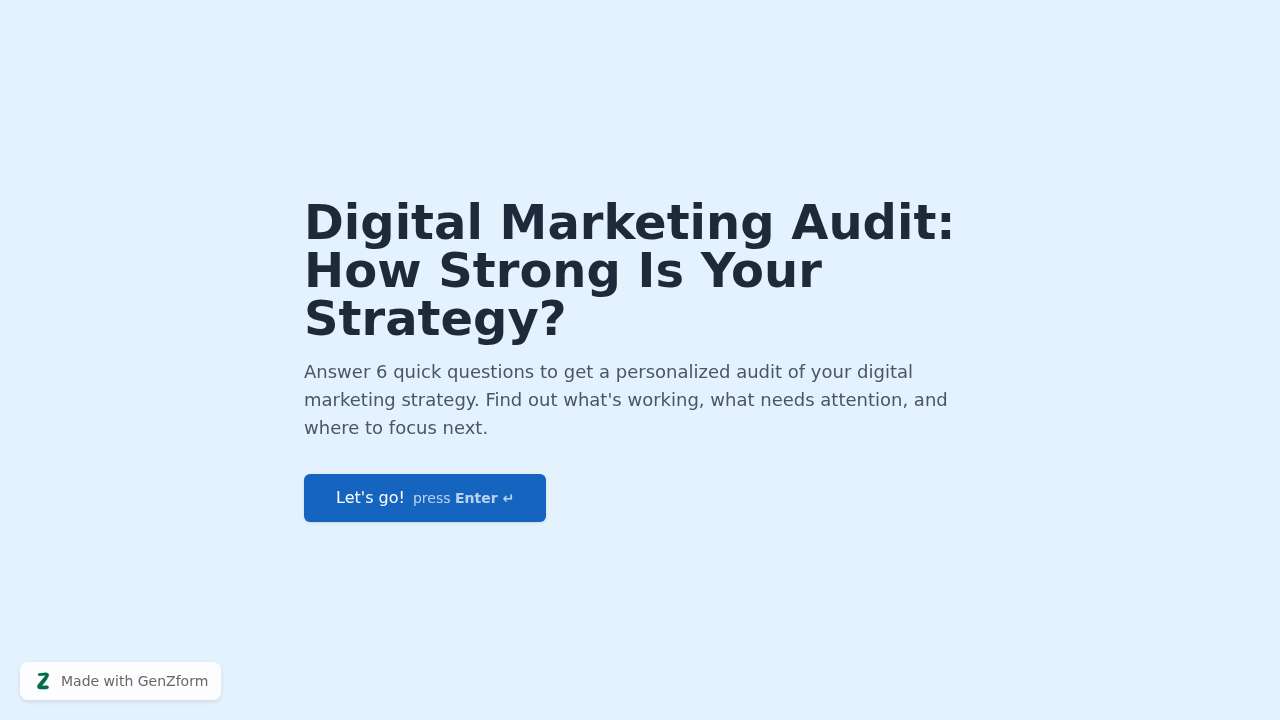 A 6-question diagnostic quiz that audits your current digital marketing strategy across SEO, content, social media, email, analytics, and paid advertising. Takes about 3 minutes to complete. Results include a personalized maturity score (Beginner, Developing, or Advanced), a breakdown of your strongest channels, specific areas for improvement, and an action plan tailored to your answers.