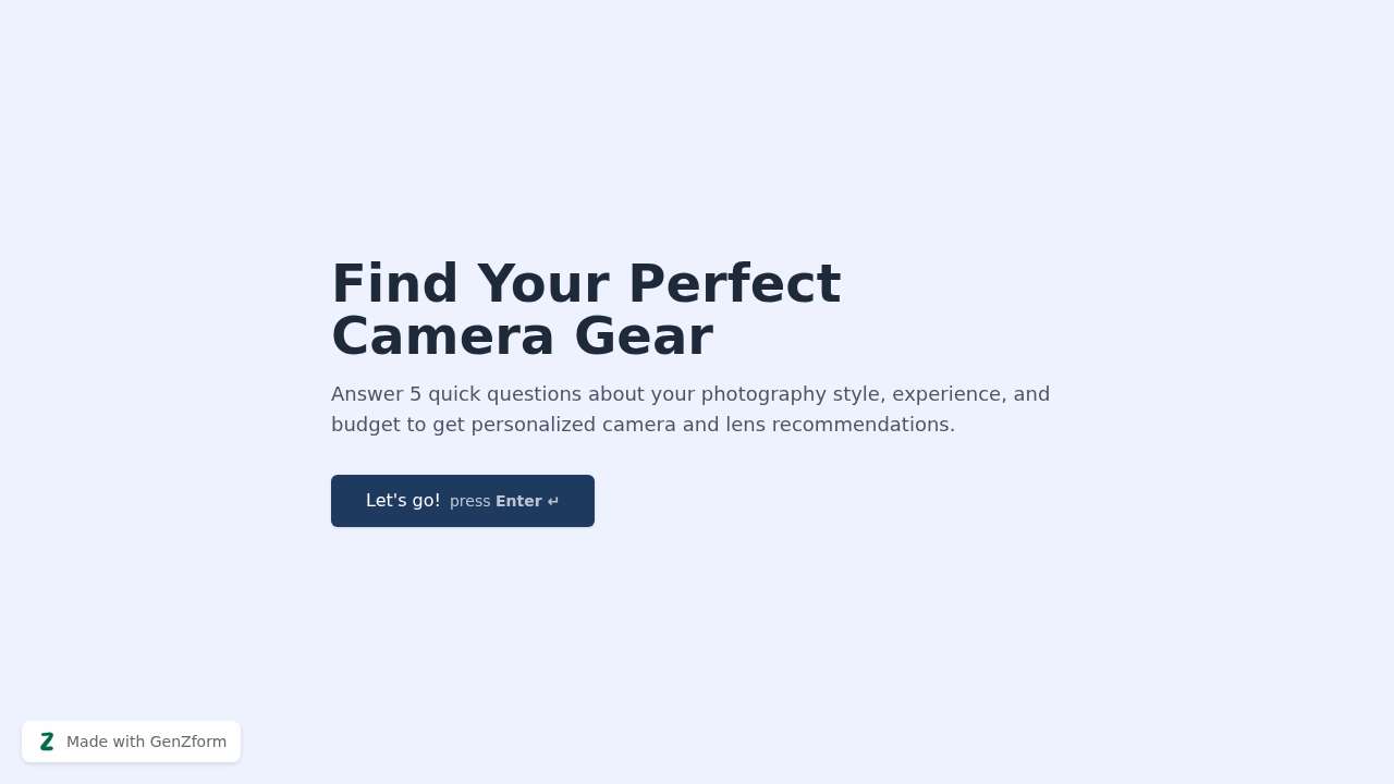 A personalized camera gear recommendation quiz covering 5 photography niches: portrait, landscape, sports and action, street, and video/content creation. Recommends specific camera bodies, lenses, and accessories across entry, mid-range, and pro budgets. 5 preference questions plus name collection, takes under 2 minutes to complete. Ideal for photography retailers, review sites, YouTube channels, and camera brands looking to engage audiences and guide purchase decisions.