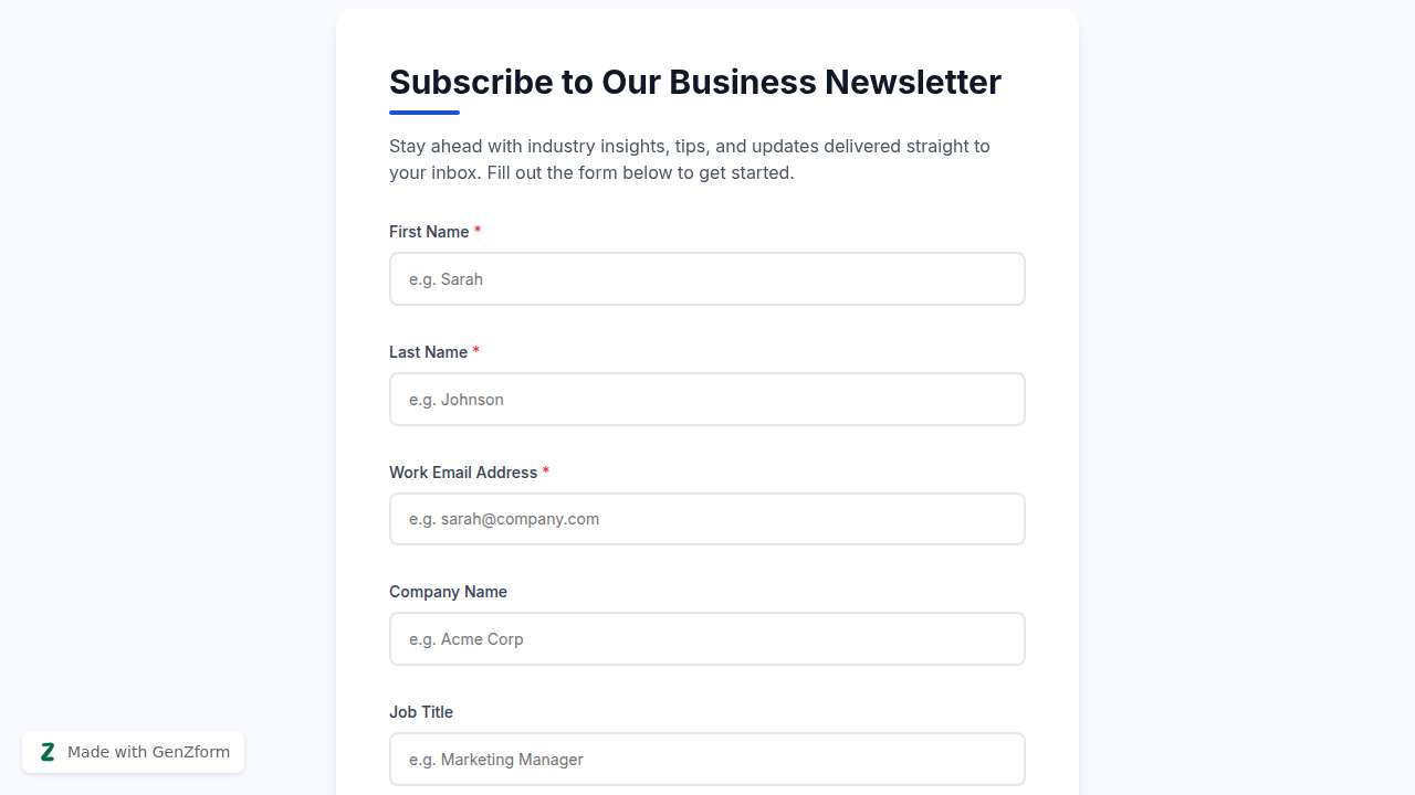 Grow your subscriber list with this professional newsletter signup form built for B2B audiences. Features: 10 targeted fields capturing name, email, job title, industry, and content preferences Dropdown for industry and company size selection Checkbox-based topic interest selection Average completion time: under 2 minutes Ideal for SaaS companies, agencies, and publishers looking to build a segmented, high-quality email list.