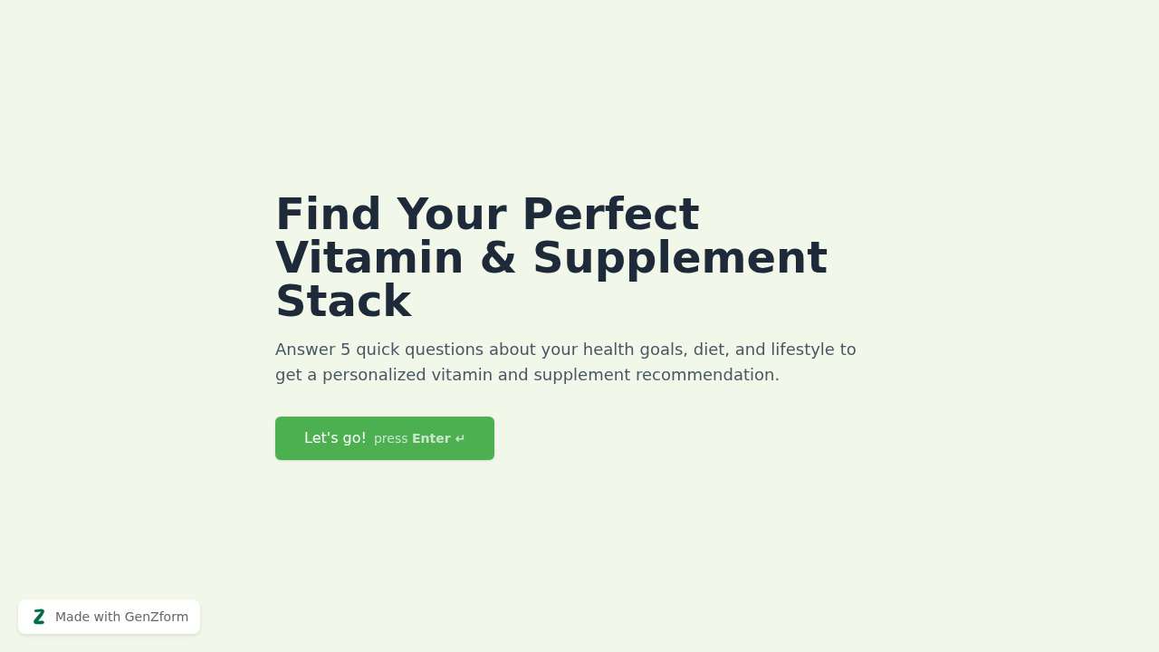 This personalized supplement recommendation quiz helps users discover the right vitamins and supplements for their specific health goals, diet, and lifestyle. It covers 6 preference questions across goals like energy, immunity, sleep, and fitness. Completion takes under 2 minutes, and the results page delivers a customized supplement stack with a morning/evening routine and diet-specific notes. Ideal for health coaches, wellness brands, supplement retailers, and nutritionists who want to guide clients without one-on-one consultations.