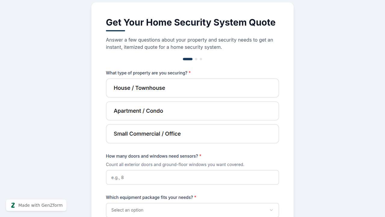 This calculator generates a detailed, itemized home security quote based on property size, number of entry points, equipment package, and add-on devices. It calculates upfront hardware costs, installation fees, and ongoing monitoring costs — then shows a complete breakdown before capturing contact details. Ideal for security companies, alarm dealers, and home automation providers looking to convert website visitors into qualified leads. Typical quotes range from $300 to $1,500+ upfront, with monthly monitoring between $0 and $30.