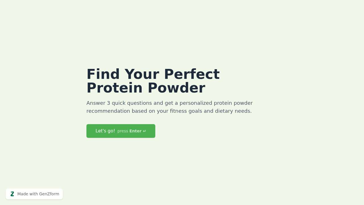 Help your audience find the right protein supplement in under 2 minutes. This 3-question recommendation quiz gathers fitness goals, dietary preferences, and activity level, then delivers a personalized protein powder suggestion with usage tips and product guidance. Great for supplement retailers, fitness coaches, and wellness brands looking to generate leads and drive purchases.